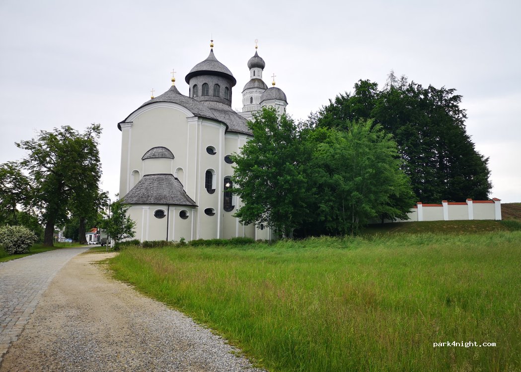 Parkplatz neben der Kirche Maria Birnbau, unweit der Autobahn 8. Ebener, geschotterter Weg mit vielen Stellplätzen. LKW-Fahrverbot, keine weiteren Einschränkungen für Pkw und Wohnmobile.