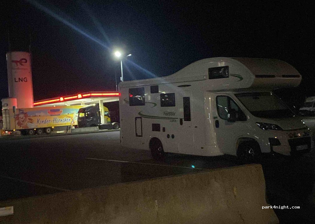 Stationnement sur une aire de repos, OK pour une nuit. Très bruyant ; on entend tout ce qui se passe dehors, surtout la circulation des camions.