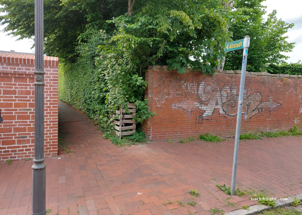 Parking directly in Weener's city center/old town. It's located parallel to a nice shopping street. There's a small park with a playground nearby. Another playground is the Katenkamp toy store on the aforementioned shopping street. There are also other nice shops, and it's a charming little old town. It's not strictly prohibited for sleeping, but it's perfect for daytime parking, at least.