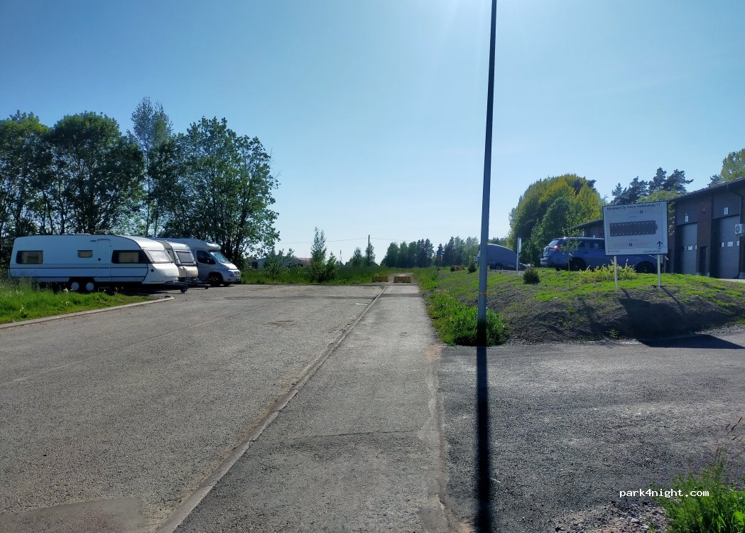 Una plaza de aparcamiento junto a dos caravanas vacías. Muy tranquilo por la noche, junto a prados y un bosque.