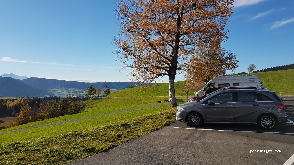 Grosser Parkplatz, Asphalt, mit guter Fernsicht Richtung Pilatus und Rigi auf der einen Seite und auf der anderen sind die Ostschweizer Alpen mit Säntis. Höhe 1077m ü.M.