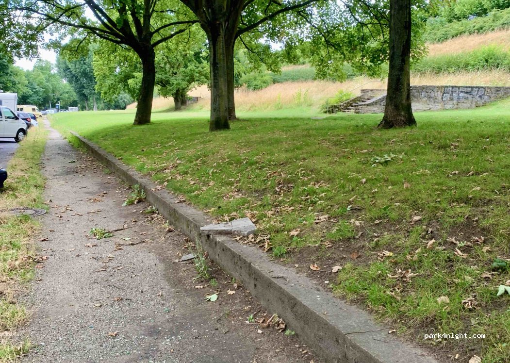 Kostenlos, eben und zum Teil schattig, mit längeren Fahrzeugen muss man sehr schräg parken, damit man nicht in den Verkehr ragt, beim Volksfest oder Fußballspielen wird es voll, Mülleimer vorhanden, Großstadtpark (!), leider sind auch seltsame Typen unterwegs, die Türen unbedingt verriegeln!