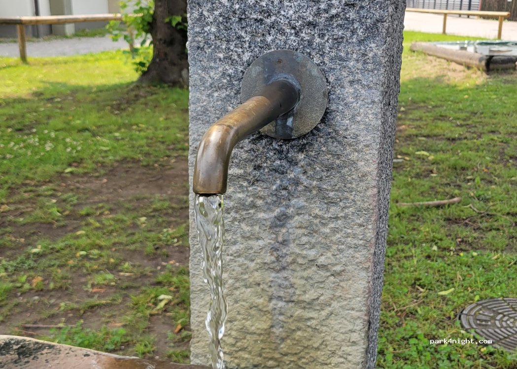 Freely accessible, public fountain with drinking water quality. It flows approximately 7 liters per minute.