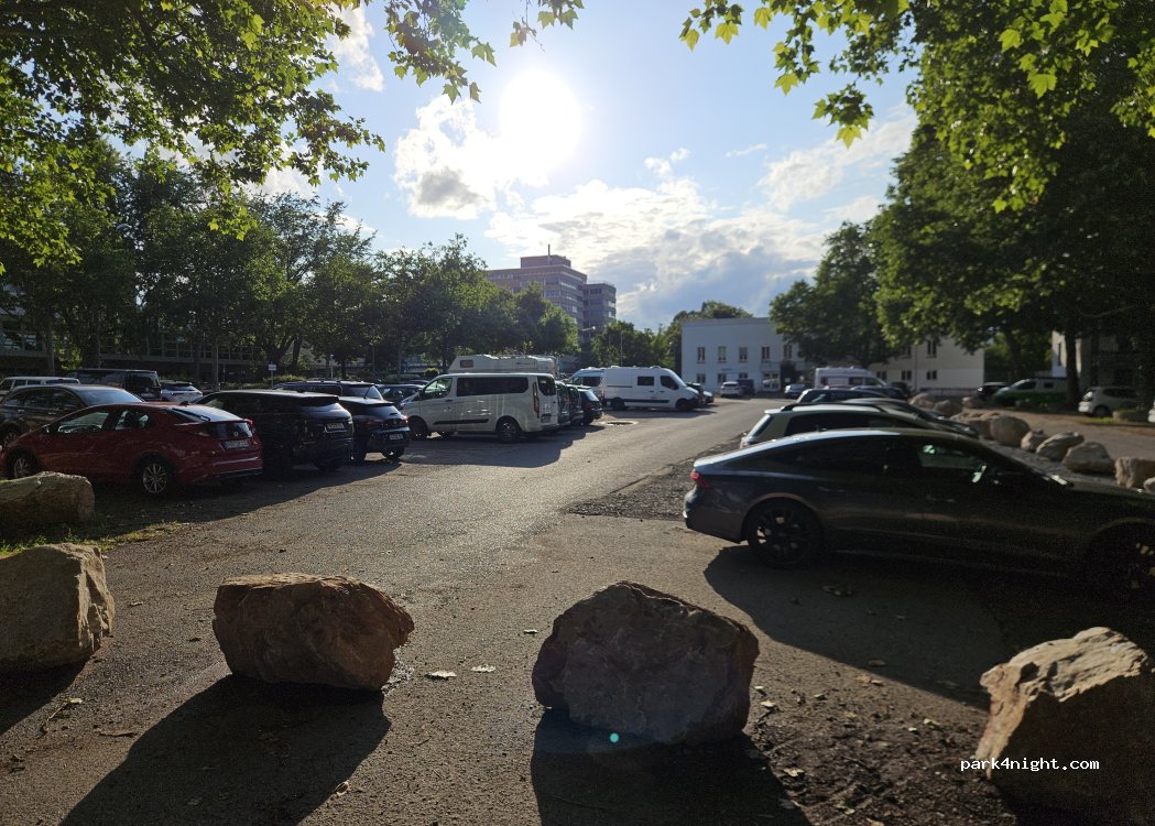 Kostenpflichtiges Parken. Keine Höhenbeschränkung. Es sind relativ ebene und schattige Plätze vorhanden. Der Lärmpegel ist nachts durchaus akzeptabel, da Parkplätze etwa 20–30 m von der Straße entfernt sind.