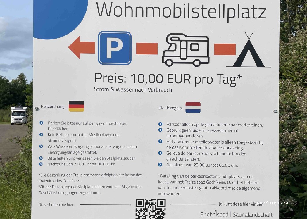 Fue nuestro lugar de llegada por la noche muy tarde a Goch y nos funcionó perfectamente. Es de pago automático y está muy bien cuidado . Tiene servicios electricidad y agua negras . Está al lado del recinto de lago y piscina de pago. Le dejo 4 estrellas porque no tiene servicios de baño ni aguas grises .