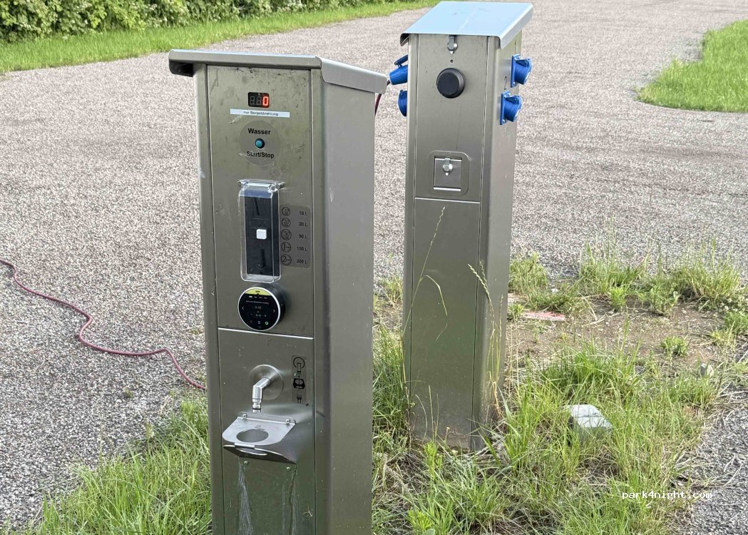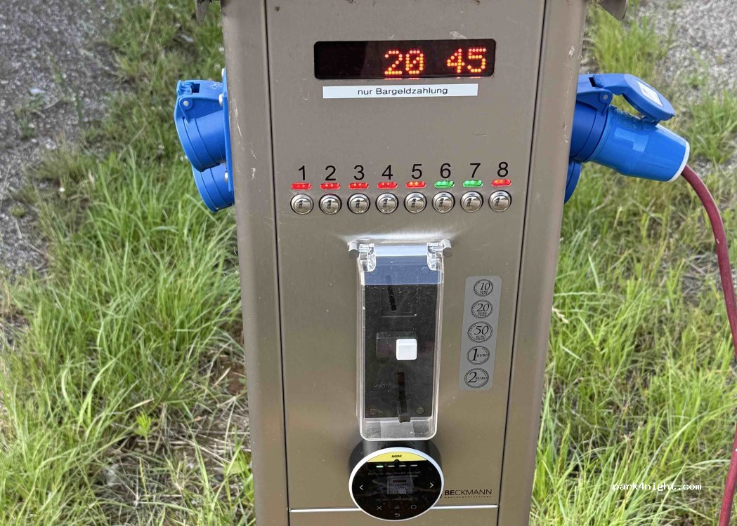 Der Platz war früher kostenlos. Wurde nun parzeliert und mit Stromanschluss versehen. Das Ticket kauft man im Schwimmbad, Strom und Wasser mit Münzen an den Säulen. Der Platz für 9 Fahrzeuge ist recht großzügig bemessen und man steht ruhig in grüner Umgebung. Leider kein Bodenablauf für Grauwasser, aber Entsorgung für WC Kassette möglich. Für 10 Euro pro Nacht wirklich fairer Preis.