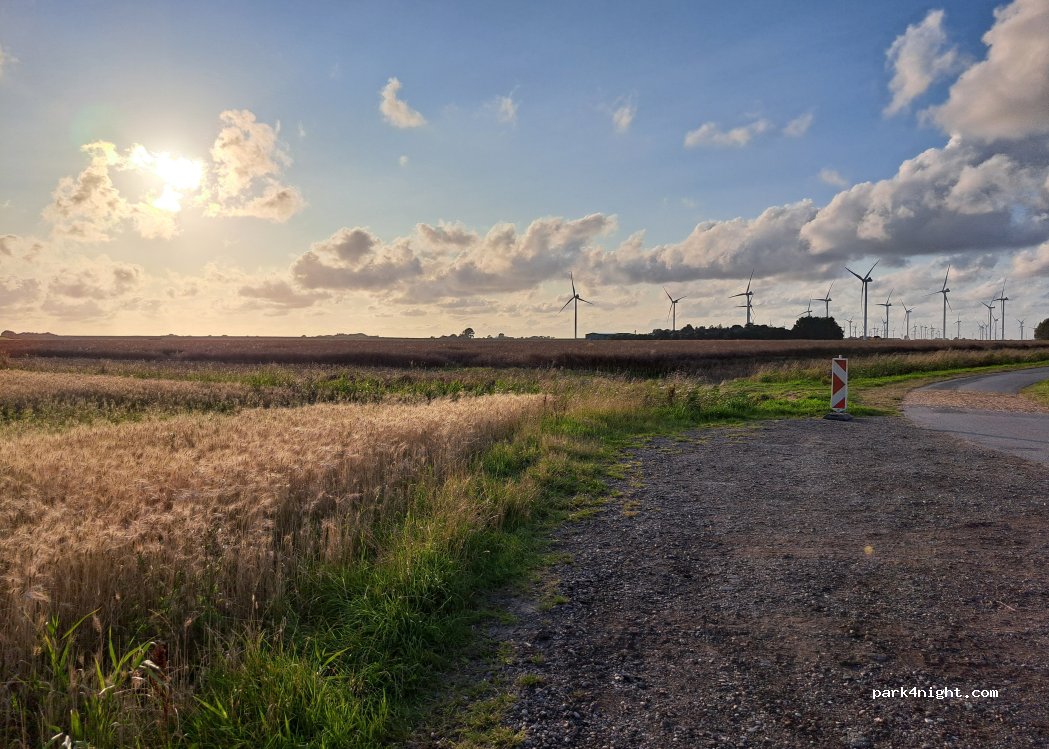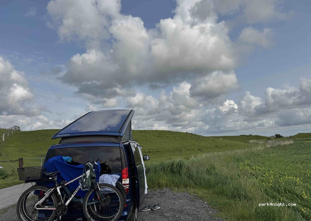 Parkplatz am Ende einer befestigten Straße an einer Fahrradroute. Zugang zum Deich. Sehr ruhig, nur Schafe und WEA‘s zu hören.