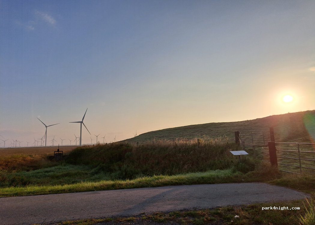 Parking at the end of a paved road on a cycling route. Access to the dike. Very quiet, with only sheep and wind turbines to be heard.