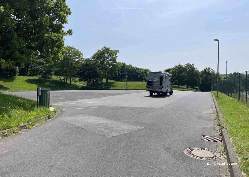 Großer Parkplatz am Sportplatz. Leicht schräg, asphaltiert und Umgebung schön grün und gepflegt. Am Freitag Nachmittag stand ich hier ganz alleine. Bei Veranstaltungen ist es bestimmt voller. Daneben ist eine Grundschule und da könnte es in der Woche auch voller sein.