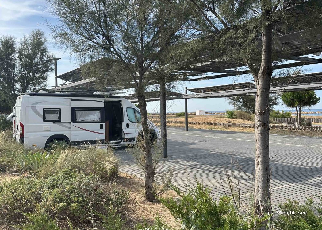 Empty and spacious car park right by the beach. The weather was appalling when we were here so totally quiet but wouldn't hesitate in staying again. Frequent payment machines for simple payment.