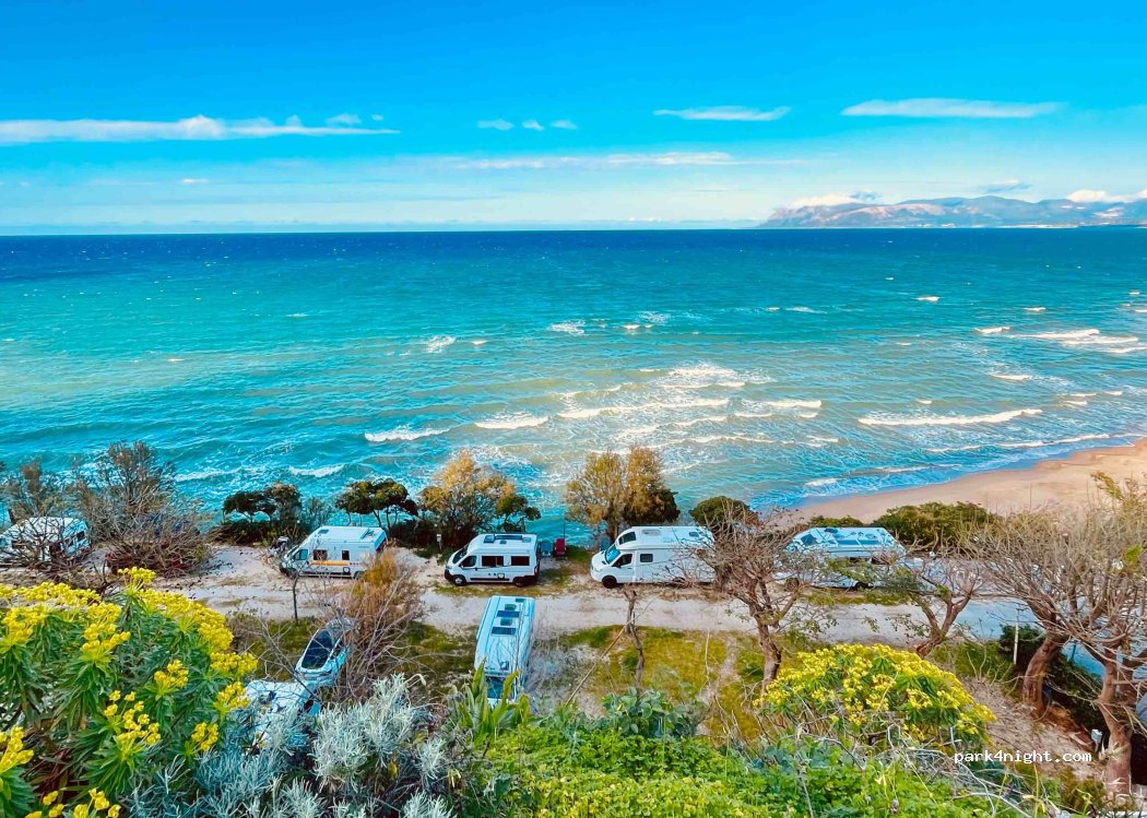 Zur Zeit nur noch wenige Plätze, Preise haben aufgeschlagen, 23 € für den Platz + zusätzlich 5 € Strom pro Tag (2 Personen). Die Zufahrt ist von Palermo kommend mit einer 180 Grad Kurve (Einfahrt) sehr eng, es kann aber weiter hinten gekehrt werden und dann ist es auch für Wohnmobile mit 7 Metern kein grosses Problem. Der Strand ist sehr weitläufig und gepflegt, Strandbars haben bereits geöffnet.
