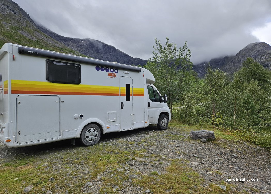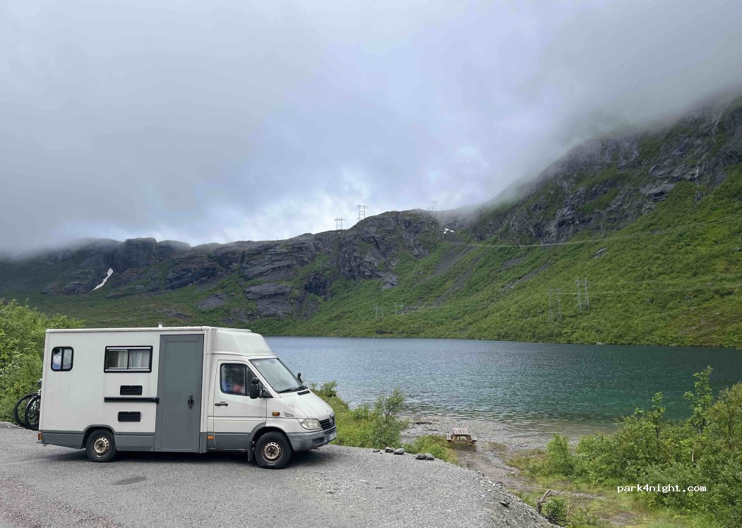 Parking bay on the toll road (130 NOK) with enough space for a campervan to stay overnight. Beautiful view of the lake. No traffic at night. There's a picnic table by the lake below the parking space. It can get windy. There are other options below and above.