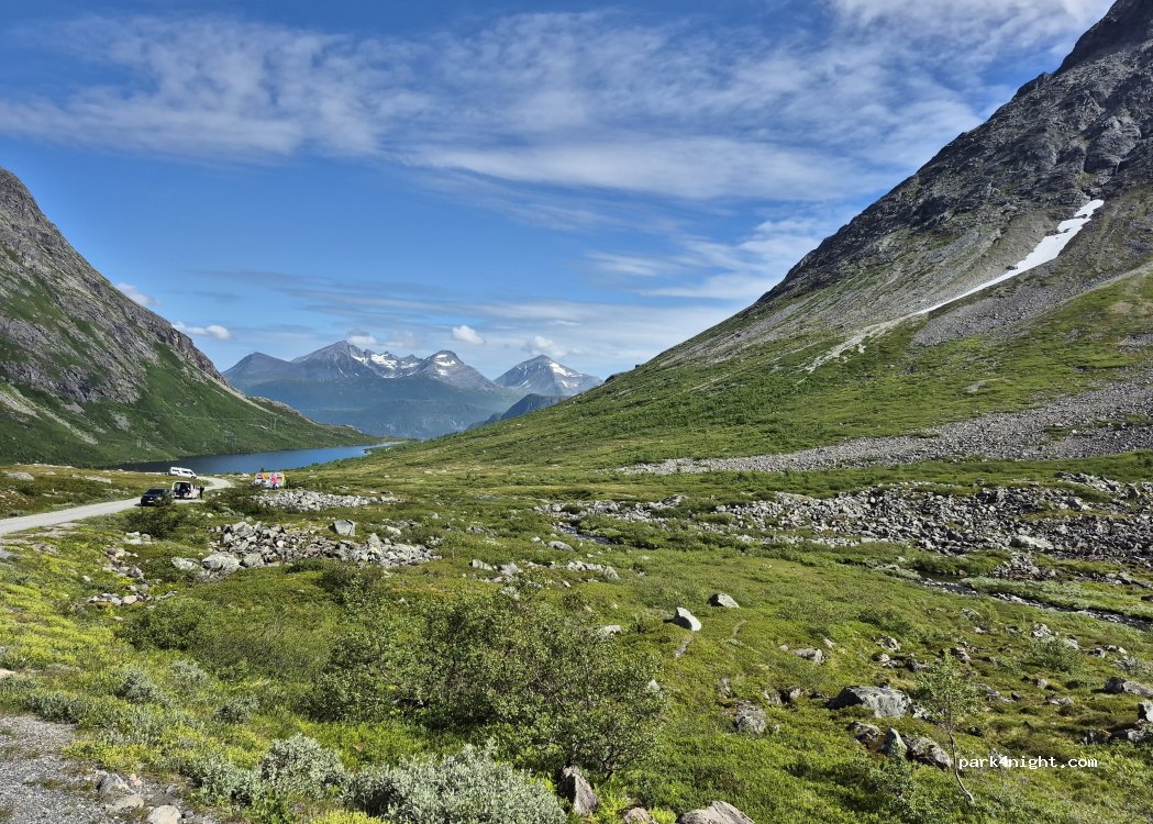 Parkbucht an Mautstraße (130 NOK) mit genügend Platz für ein Wohnmobil zum Übernachten. Schöne Aussicht auf See. Nachts kein Verkehr. Unterhalb des Stellplatzes ist ein Picknicktisch am See. Es kann windig werden. Unterhalb und oberhalb gibt es weitere Möglichkeiten.