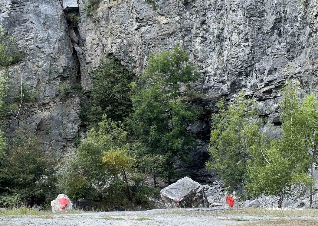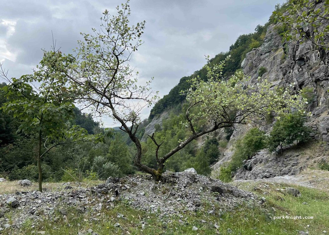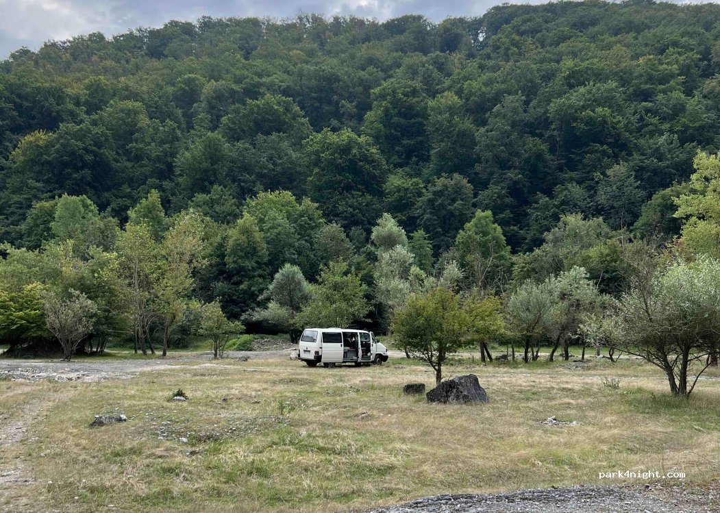 Eine Seite mit dichtem Wald. Andere Seite eine ca. 70m hohe Felswand. Es gibt einige Feuerstelle und es ist sehr sauber. Es gibt schattige (für kleinere Fahrzeuge und Sonnige Plätze. Wohnmobilen über 7m würde ich aber nicht empfehlen dort hin zu fahren. Zu viele Unebenheiten. Achtung ⚠️ an einigen Stellen Schauen Rohrstücke aus dem Boden.