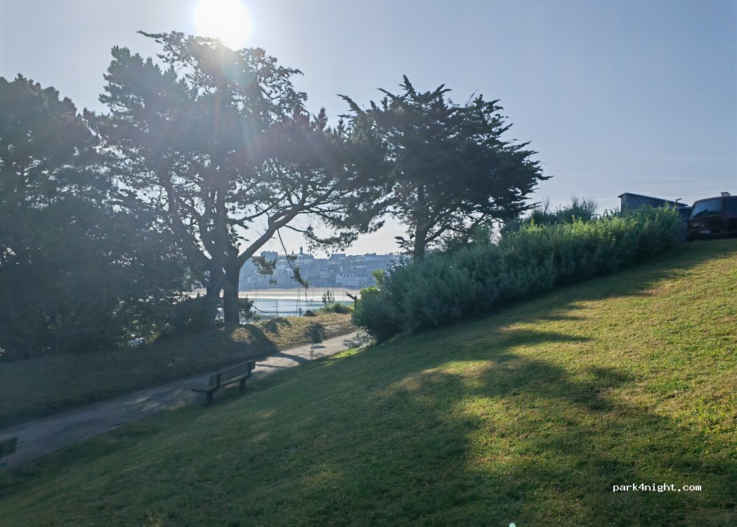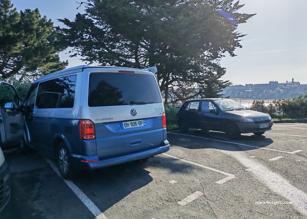 plusieurs places de parking. peu ombragé. certaines places sont légèrement en pente. Vue sur le port