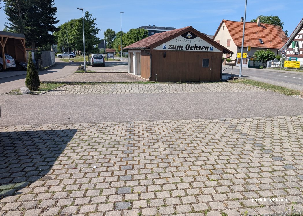 appel au restaurant pour savoir s’il restait des emplacements disponibles. 8 emplacements au sol au total (réservés aux vans, camping-cars…). Possibilité de prendre l’électricité, sinon stationnement gratuit ! En bordure de route mais lotissement non loin donc plutôt calme. Seul bémol: pas d’ombre, si ce n’est le long du cabanon). Nous avons mangé au resto Zum Ochsen, très bon!