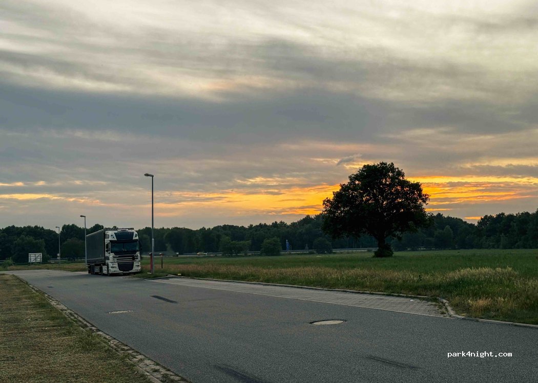 Mainly used by lorries, but when I arrived in the evening, it was mostly empty (only two parked). Room for at least 4–5 campervans. Almost level surface, no levelling blocks needed. Some greenery around – not scenic, but peaceful and safe for a quick stopover on a long drive.