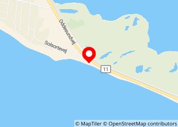 Área de descanso pavimentada y de grava, parcialmente separada de la carretera por árboles.