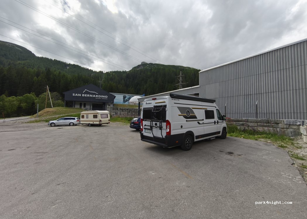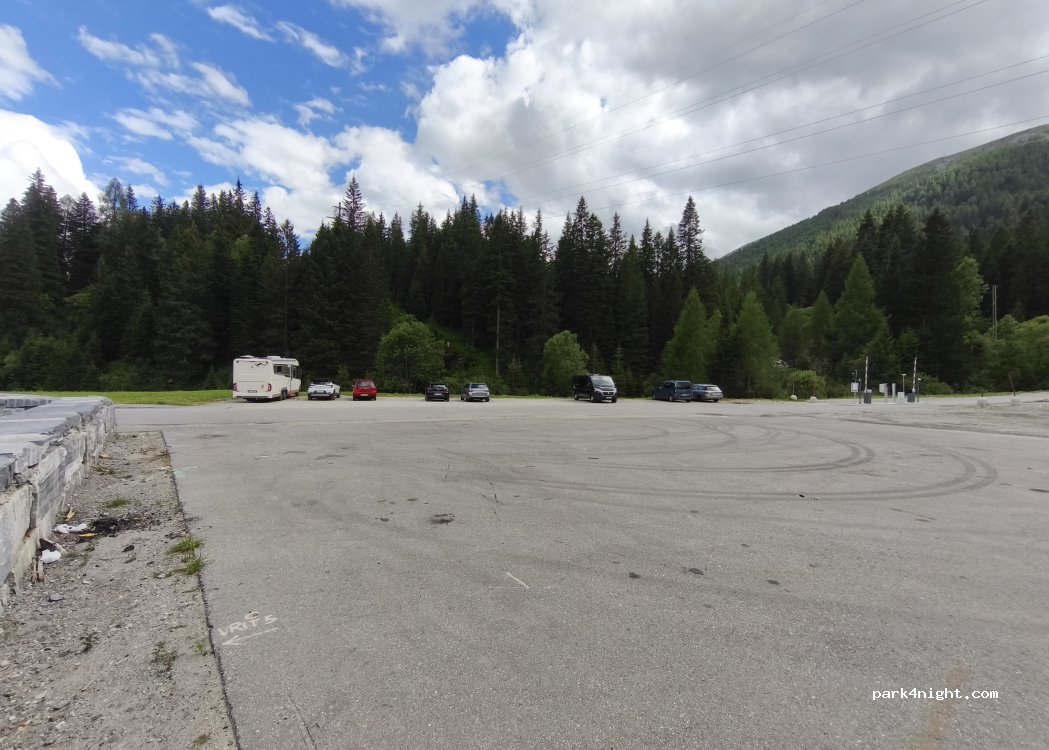 Parcheggio in piano abbastanza ampio ai piedi dell'attacco della seggiovia. Ormai è l'unico dove si può pernottare perchè hanno messo divieto di campeggio su tutto il territorio comunale di San Bermardino. comodo per andare in paese a piedi e raggiungere il lago sempre a piedi.