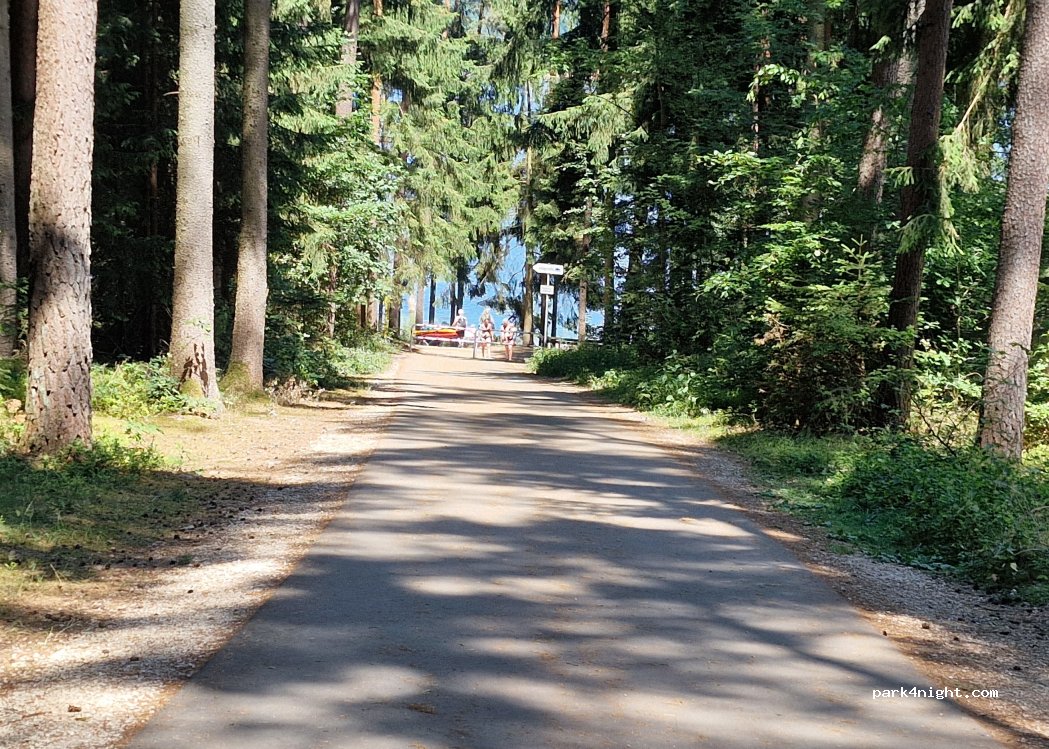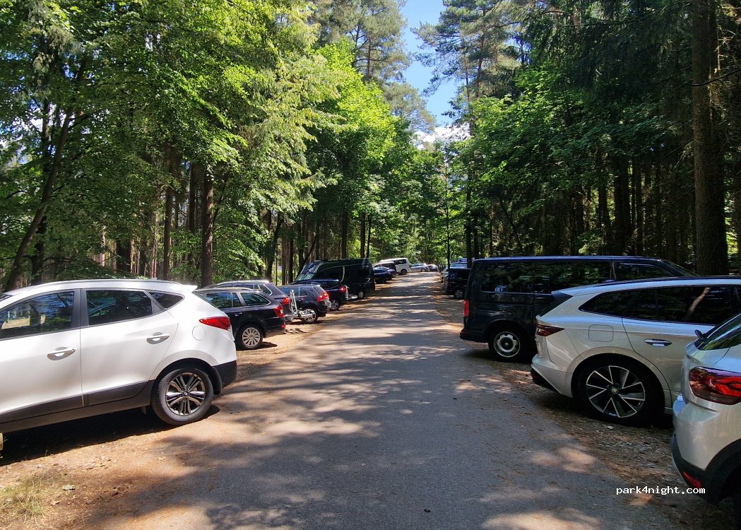 Aparcamiento de Pleinfeld en Brombachsee. Aparcamiento mixto bajo árboles (mayormente con sombra). Solo apto para furgonetas. Prohibido por la noche. A un corto paseo del lago (ver foto).