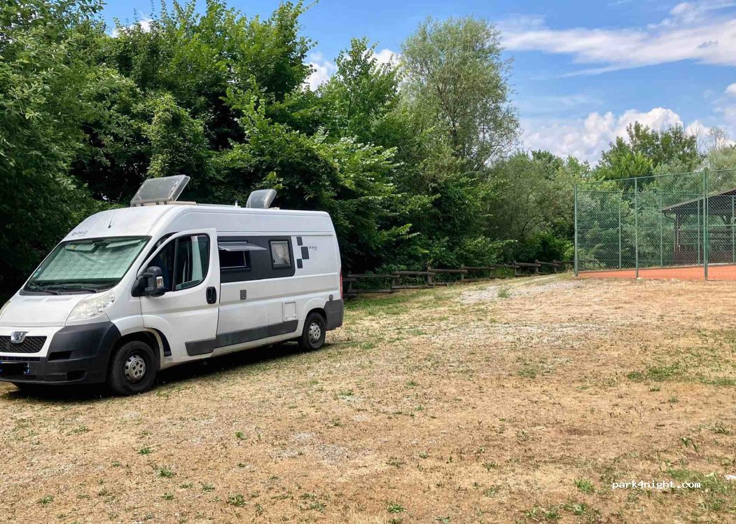 Parking on a grassy area adjacent to the tennis and beach volleyball courts, overlooking the Liubljanica River and able to accommodate numerous vehicles of all sizes and categories. Ideal for a lunch or dinner break, but obviously, even if there are no signs, it is most certainly prohibited for the night, like any Slovenian car park where it is not explicitly permitted! A few shaded areas depending on the time of day.