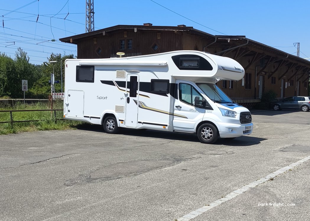 Parking next to the train tracks and some houses. Just 10 minutes from the center. We arrived by mistake because the GPS gave us the wrong address. I don't know if we could spend the night, but it might not be the best place to stay because it's right next to the tracks. We used it to see the town.