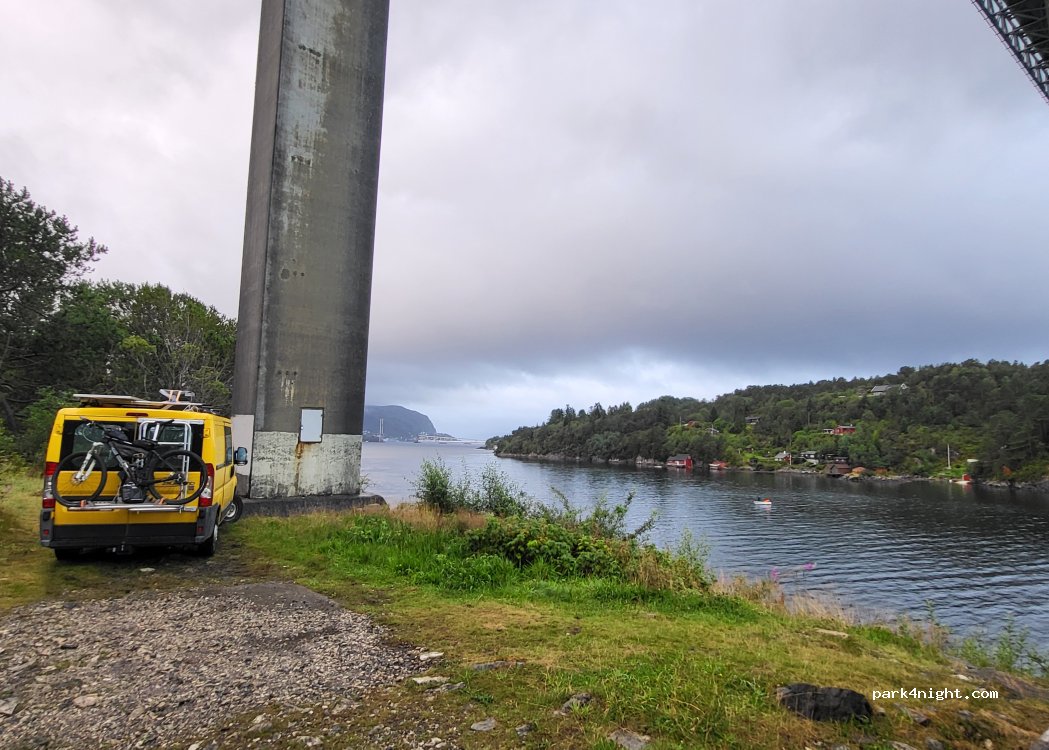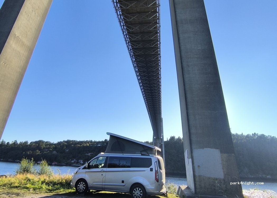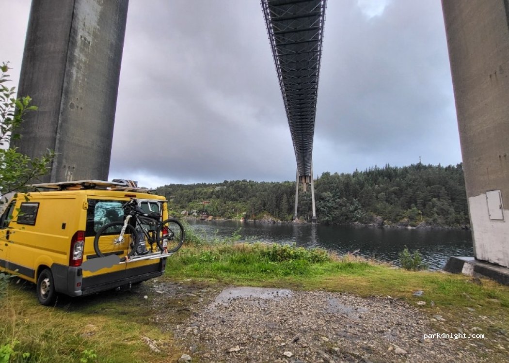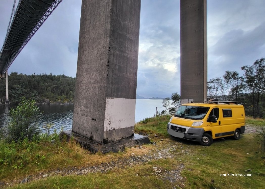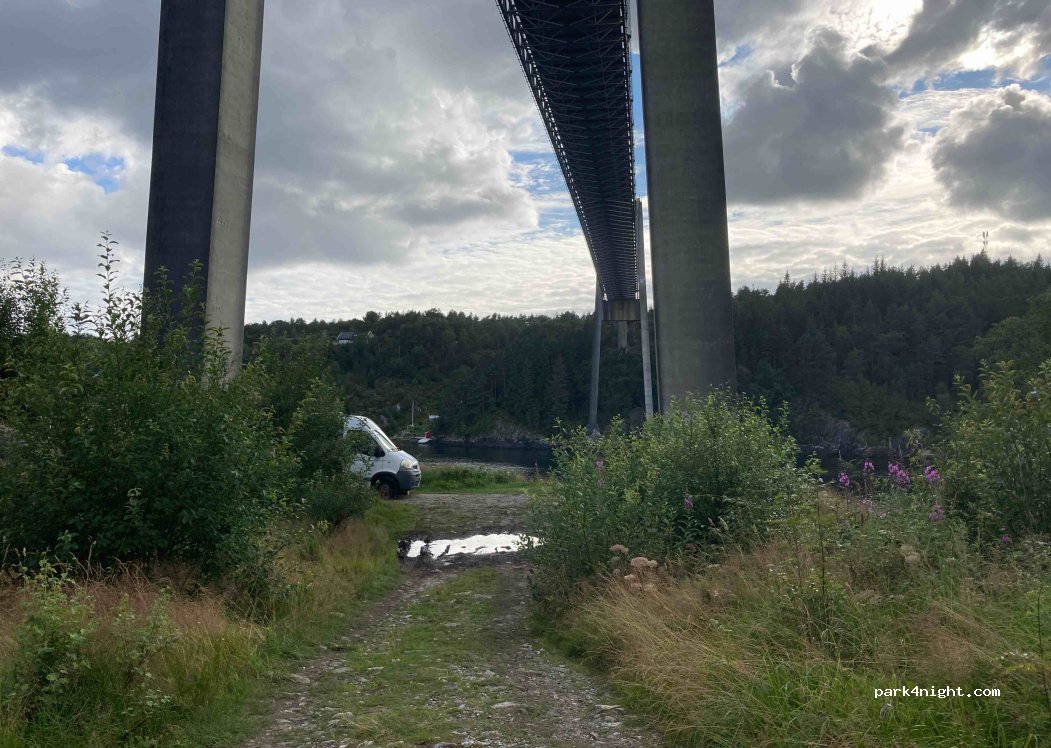 Nice quiet place, just by the shore. Nice view, too. Somebody mentioned lots of poo around - not my experience. (you should dig in yours) No disturbance in almost 24h, just 3 fishermen passed by. During the rain, big water drops were falling from the bridge, creating quite loud sounds on the roof of my van... (earplugs for the night)