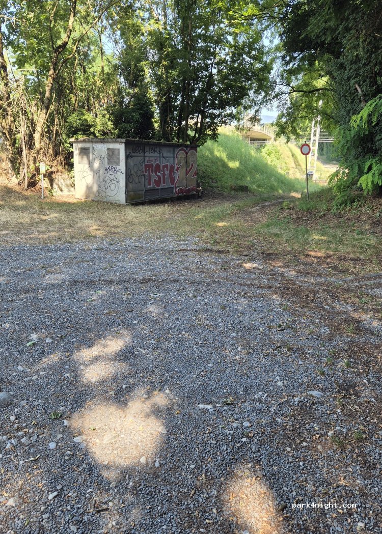 On the edge of the forest between the road and the railway. Convenient for 1 night. Shaded.