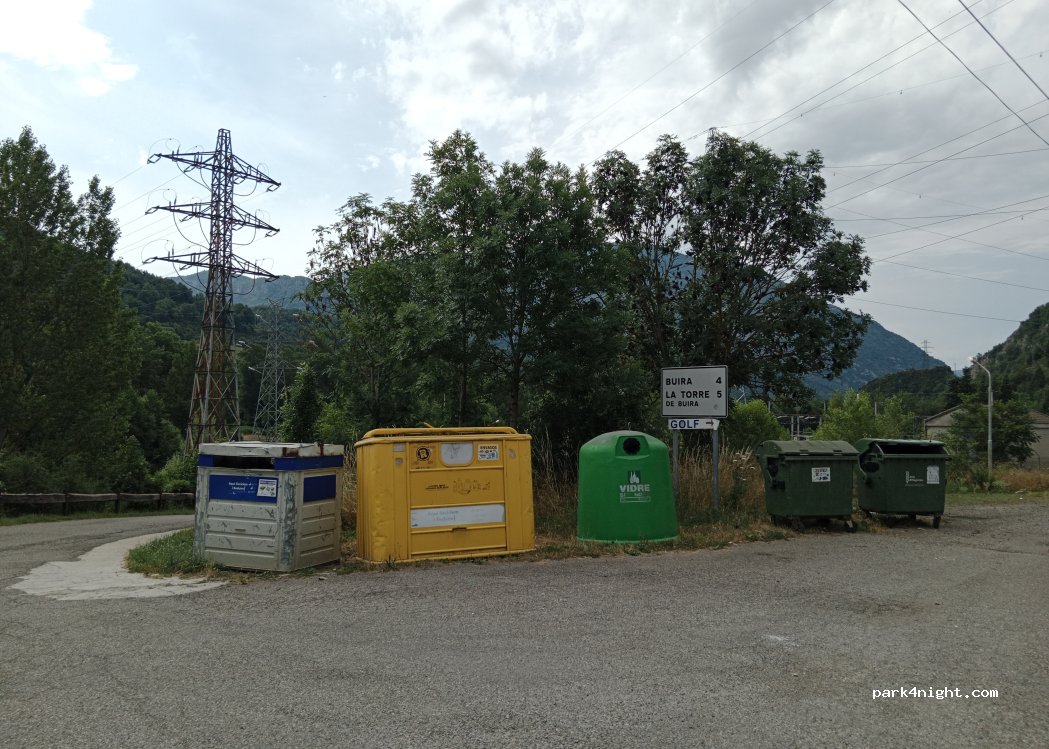 Un rincón súper bueno para una mini camper, con mesa de picnic, papelera y contenedores cerca, pasamos una noche tranquila muy cerca del rio, pasó la patrulla de policía por la noche y no nos dijeron nada, sitio idílico. enfrente del instituto de educacion secundaria de Pont de Suert, en verano no hay nadie, en epoca escolar es posible que sea diferente.