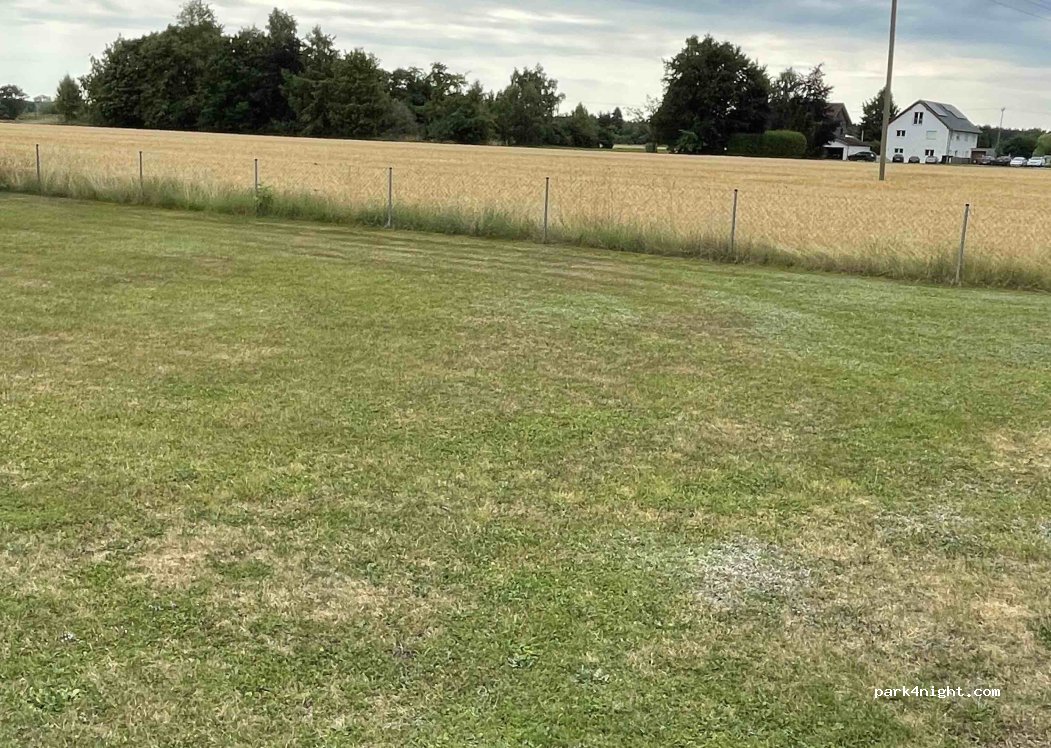 Unser Stellplatz liegt auf einer privaten Wiese mit ländlichem Ausblick – perfekt für eine kurze Pause vom Trubel.