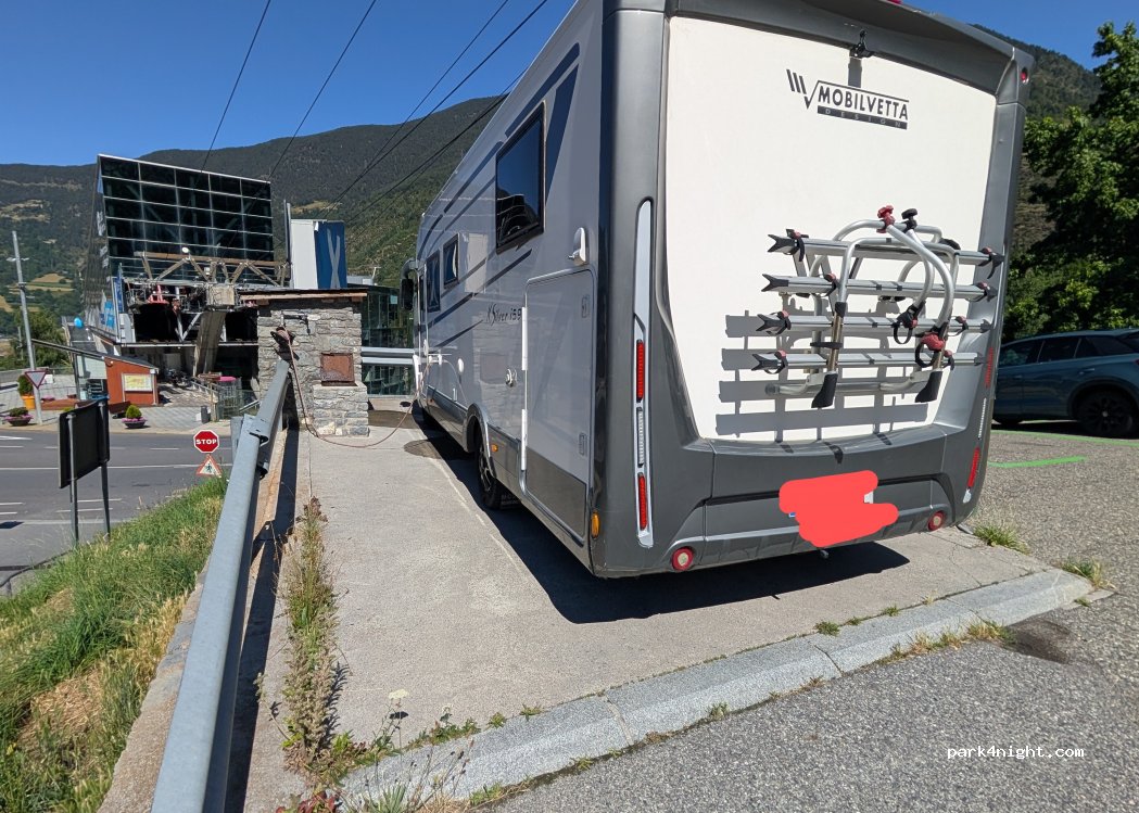 Zona de vaciado y llenado, justo enfrente del funicump. Es zona verde, por lo que entiendo que se puede estacionar también, aunque cuando llevamos no había ninguna autocaravana estacionada. El Parking son tres alturas.No ay ninguna prohibición de estacionamiento para autocaravanas como en otros lugares, sí que las hay.