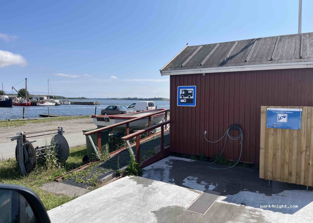 Aire de vidange eaux grises et noires. Eau potable pour remplissage. Au fond du parking du Lidl et Super Brugsen, près des bateaux. Merci à la municipalité de mettre ce service à disposition.