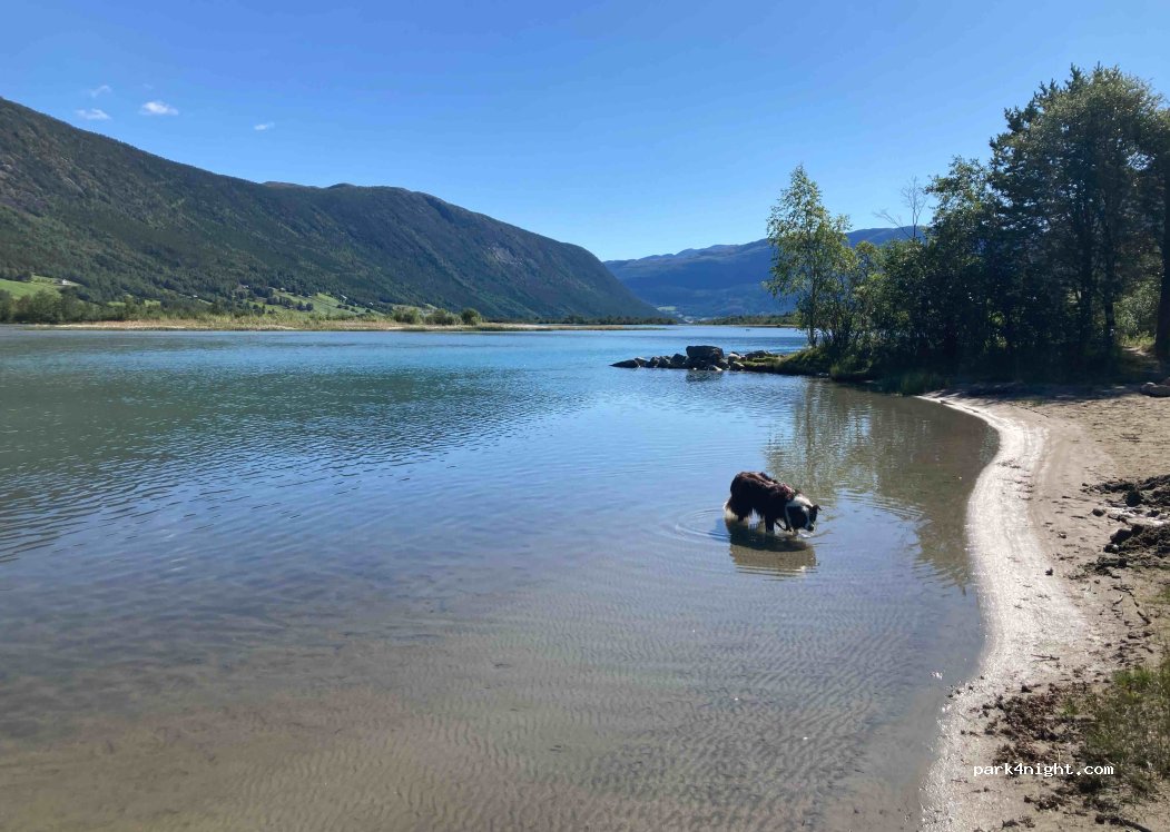 Schöner ruhiger Campingplatz, mit Badestelle und Bergblick. Stellflächen auf Wiese oder Waldboden, z.T. unter Nadelbäumen. Etwas verwinkelt, es gibt einige sehr geschützte Stellplätze. Ordentliche Sanitäranlagen, 8 Min Duschen 10 NOK. Küche gut ausgestattet, vielleicht etwas klein, beim Kochen und Abwaschen muss man manchmal anstehen. Kleiner Spielplatz, Highlight für die Kids sind die Kettcars!