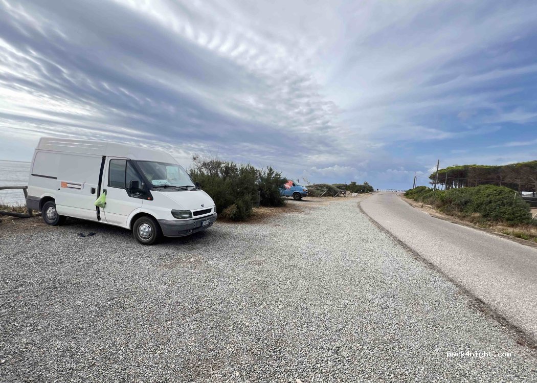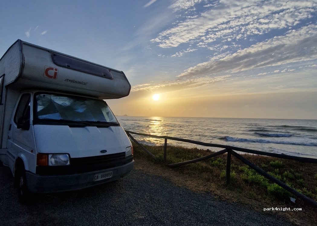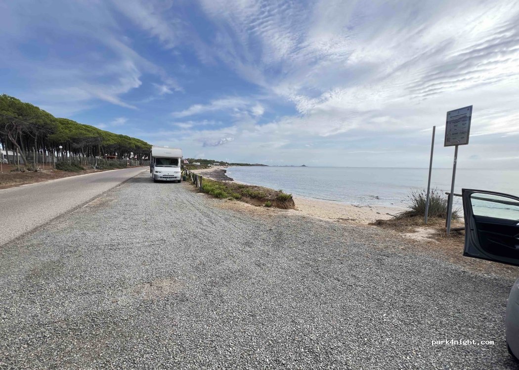 Parcheggio gratuito giorno e notte sul mare, fronte campeggio. passano poche auto. si dorme benissimo. a 5 minuti a piedi c è una zona bagni gratuita con doccia. si può entrare nel campeggio che c è poco piu avanti che ha un bar e il market.