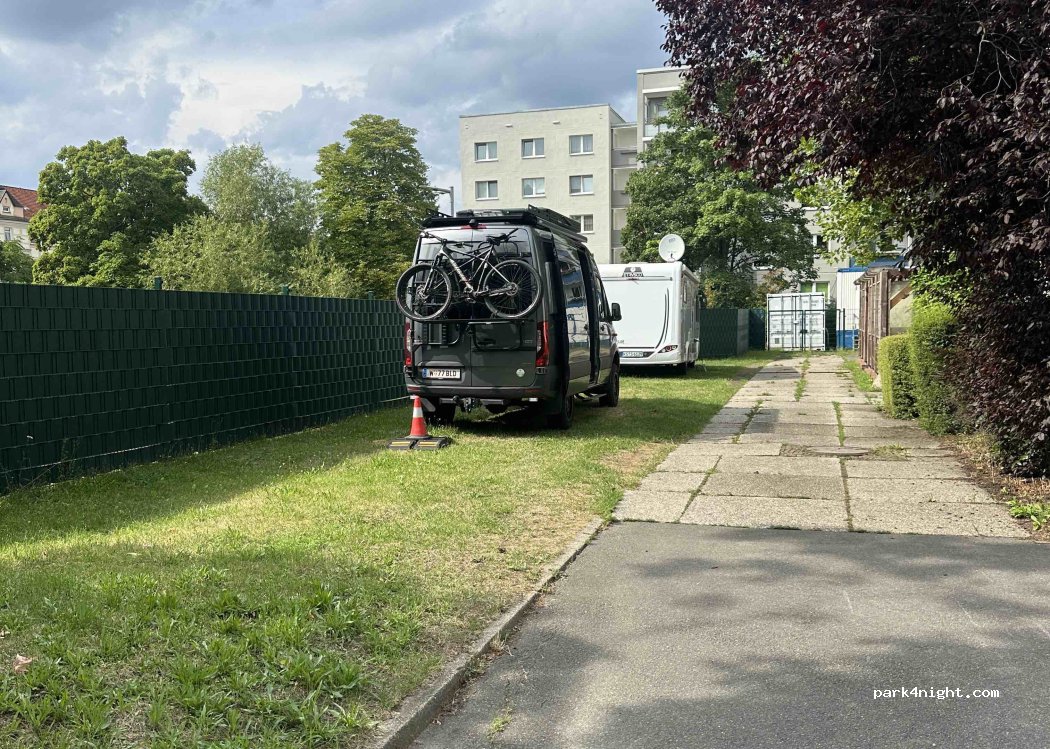 Privat geführter Stellplatz auf Privatgelände, Stellplatz auf einer Wiese an einem ehemaligen Restaurant, auf umzäunten und abgeschlossen Gelände, maximal 3 Plätze, fast eben, 350 m zum Supermarkt, 350 m zur Straßenbahnhaltestelle, 3 km zum Hauptbahnhof und in die Innenstadt, ruhige Wohngegend