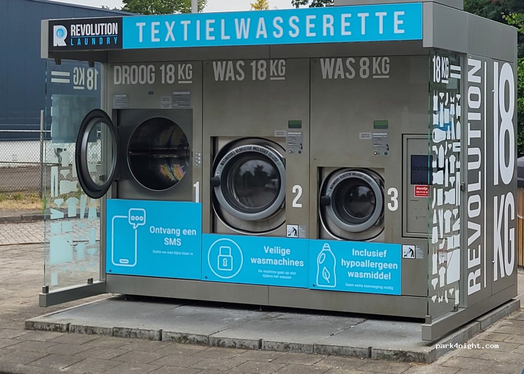 Textilienwäsche neben einer Tankstelle. Vier Waschmaschinen mit vier Parkplätzen direkt davor.