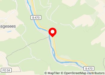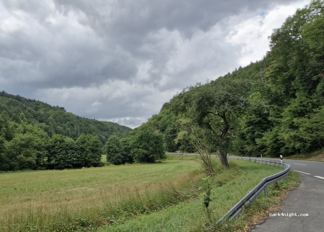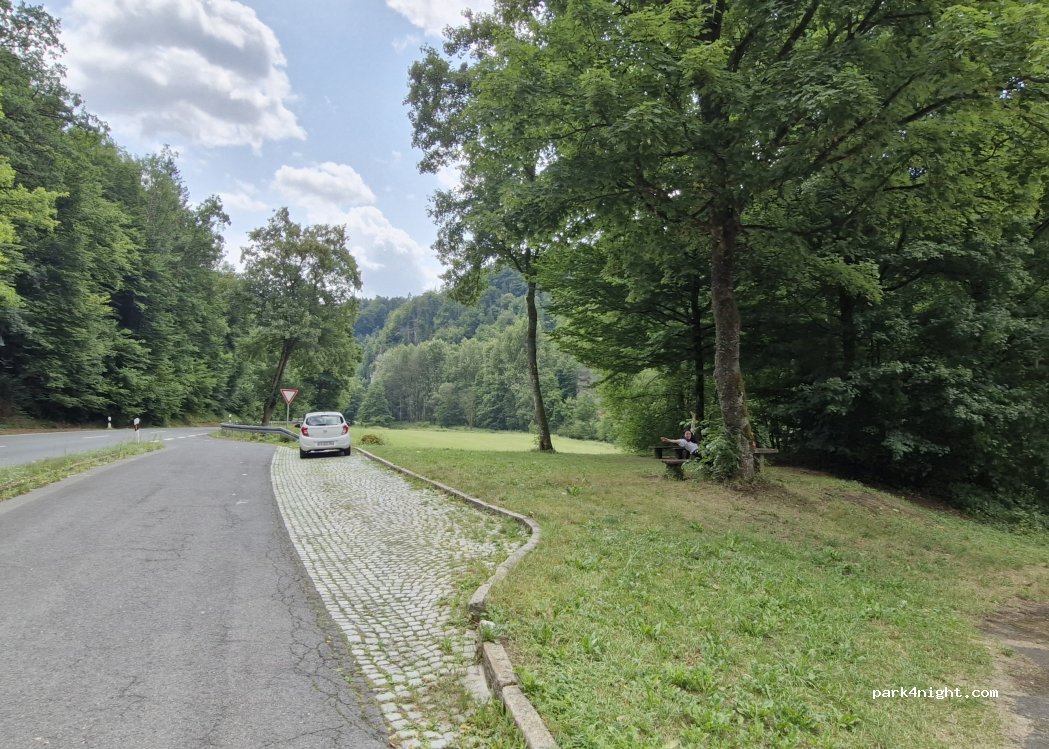 Kleiner Parkplatz mit zwei schattigen Picknicktischen am Straßenrand