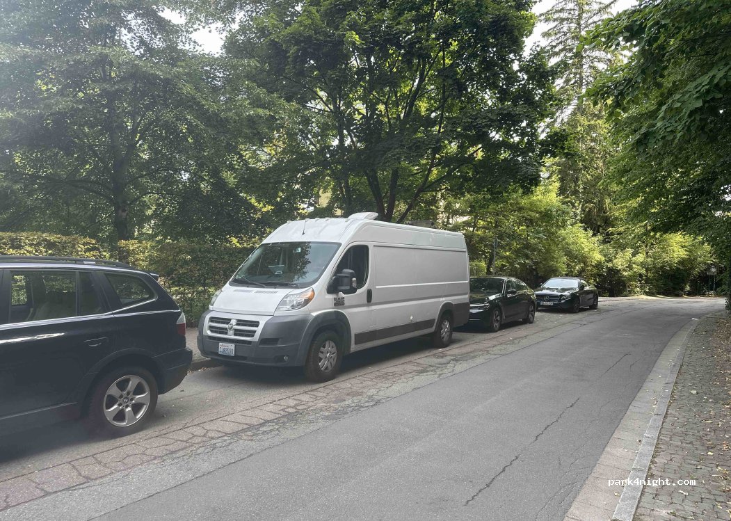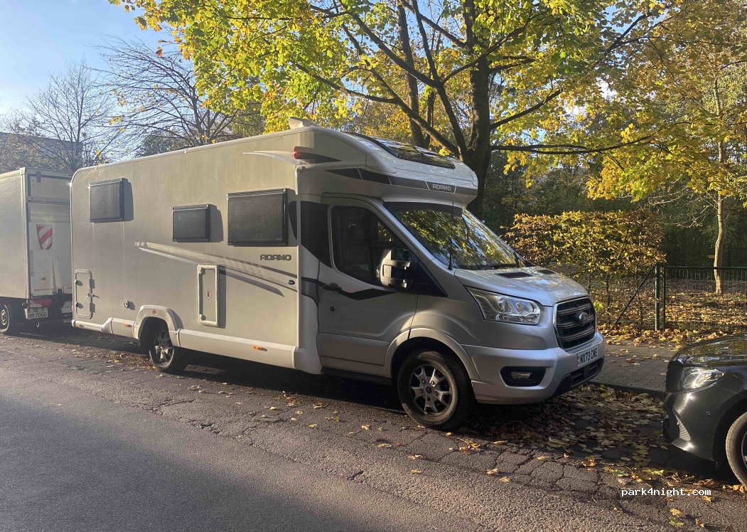 This is on street parking. Free. Flat. Quiet neighborhood near castle and castle parking. We spent 24 hours here from Saturday to Sunday. Safe. Friendly people walking, jogging, taking dogs for walk. It’s an area between no parking signs that is the only allowed parking area. About 40 meters in total