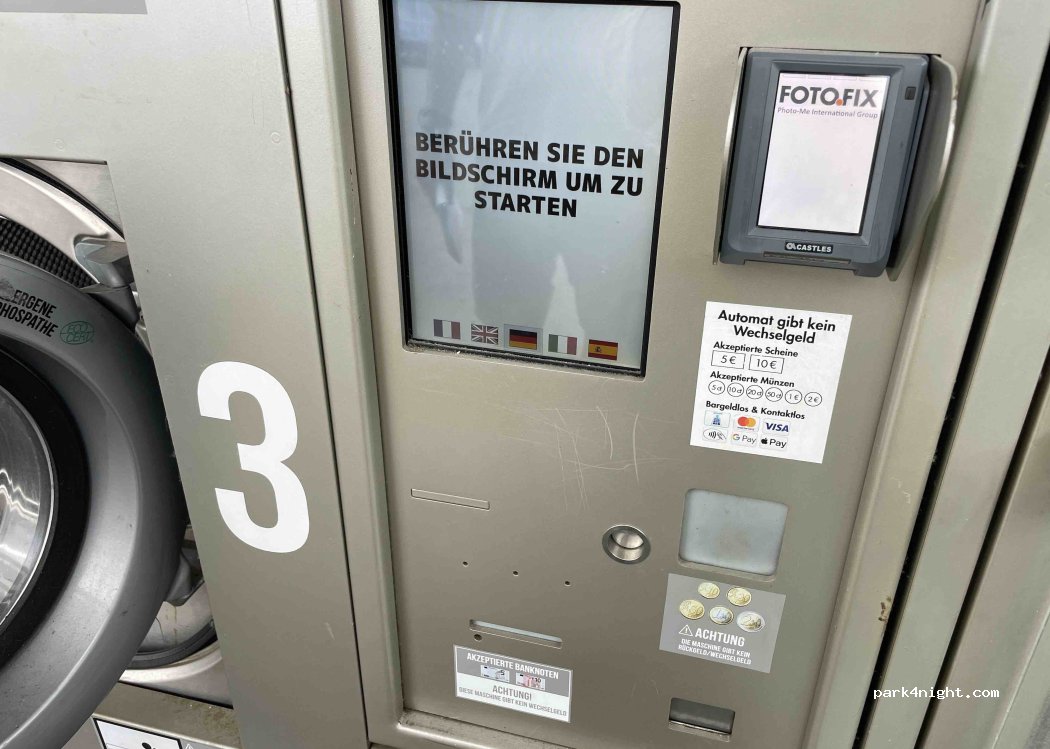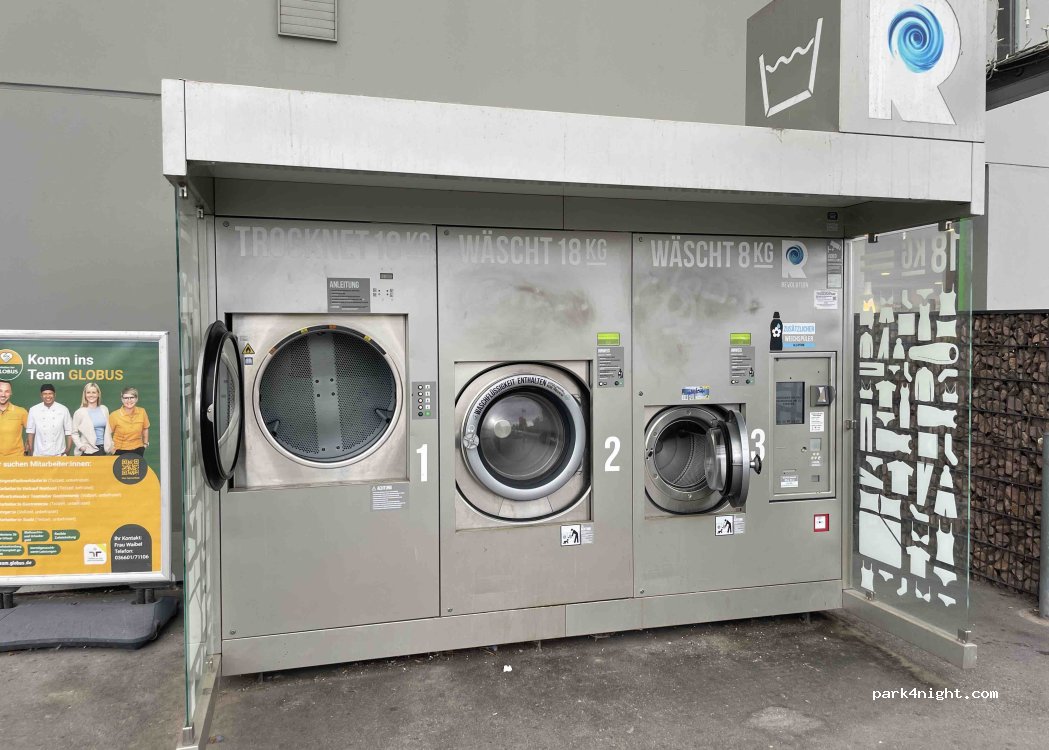 Frei zugängliche Waschmaschinen vor dem Globus/Shoppingmall. 1x 8kg, 1x18 kg und 1x 18 kg Trockner.