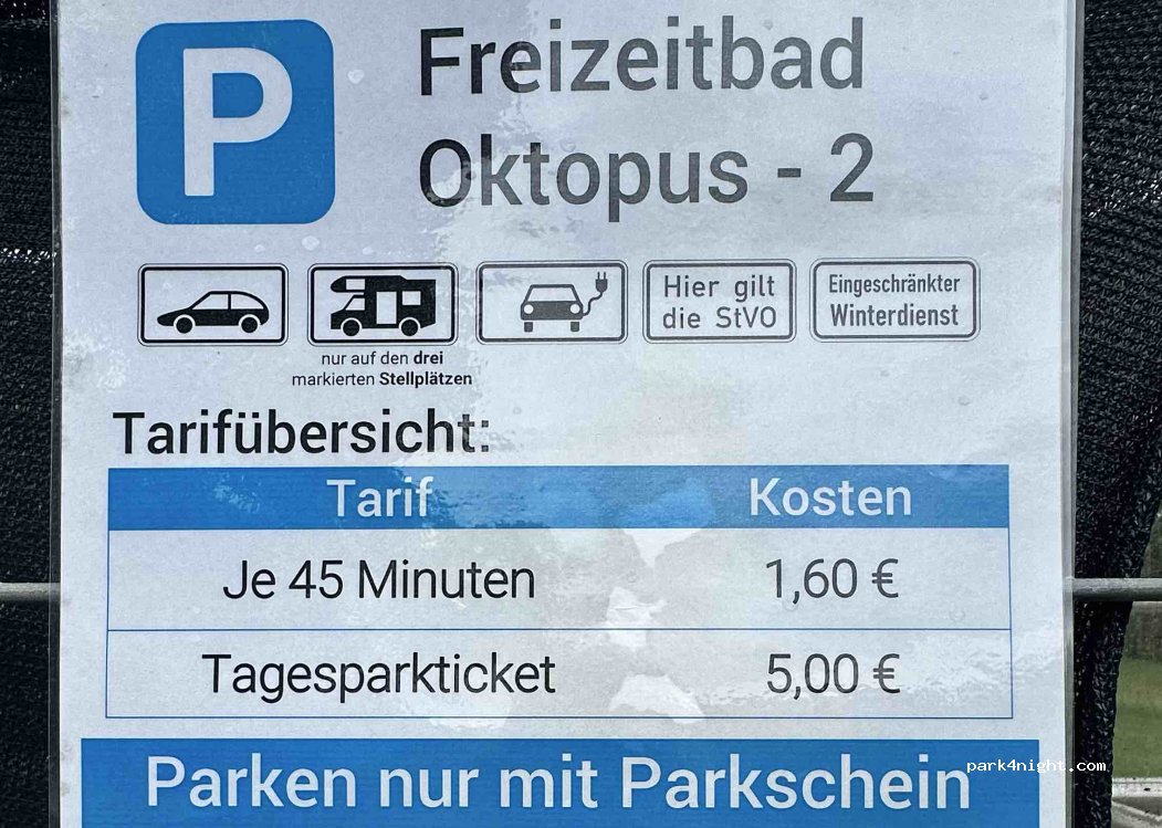Hay dos plazas de aparcamiento de pago para autocaravanas en el aparcamiento de la piscina recreativa Oktopus. Nota: Si viene del centro, utilice el aparcamiento inferior; las plazas están señalizadas. El aparcamiento superior (cerca del hotel) no está disponible para autocaravanas. El centro de la ciudad, con su plaza del mercado y atracciones como el Michaelsberg, se encuentra a poca distancia a pie. Las piscinas exterior e interior, que incluyen una torre de buceo interior (20 m de profundidad), se encuentran justo al lado del aparcamiento.