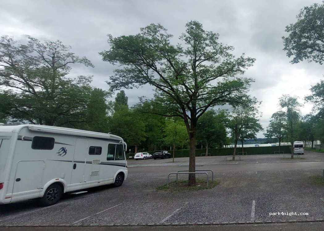 Grand parking au bord du lac, en partie sous les arbres.
