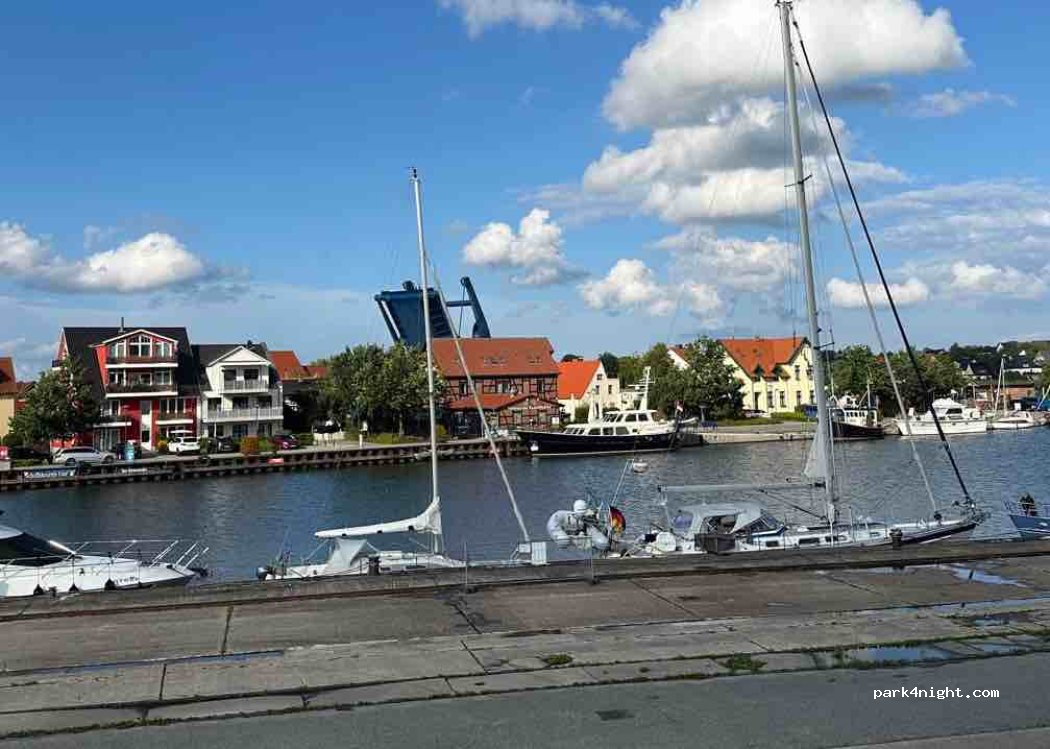 Plaza de aparcamiento para autocaravanas directamente en el puerto de la ciudad de Wolgast.