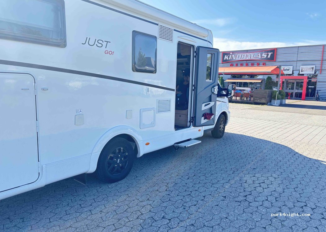 Vor dem Kinopalast, waren Abends 20:15 im Kino und haben die Nacht auf dem Parkplatz gestanden. Morgens ab 6 Uhr hört man den Verkehr…..aber sonst keine Probleme… nachts war es ruhig