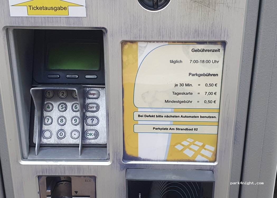 Paid parking at Strandbad Wandlitz. Space for campers on the back. Parking fee according to automat. No service for campers, restaurant, snack bar just over, train station nearby