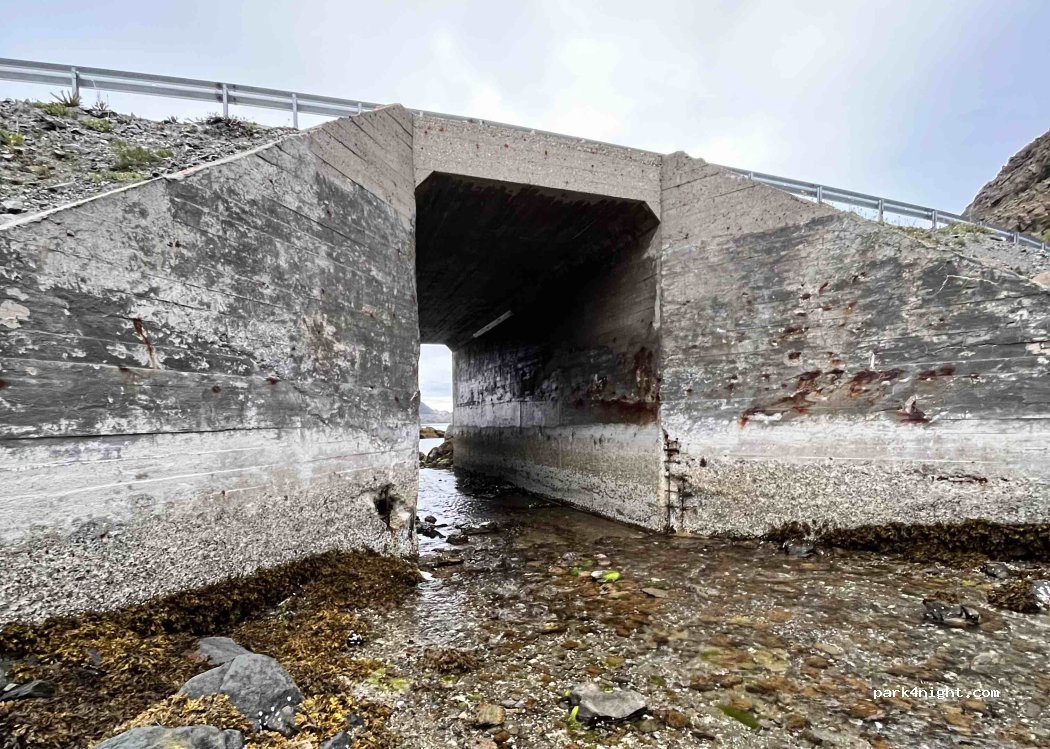 Nothing more than a parking lot of 2 spots with a nice view of mountains and a beach where you can pick up mussels, crab claws, and so on. Even swim if you want.