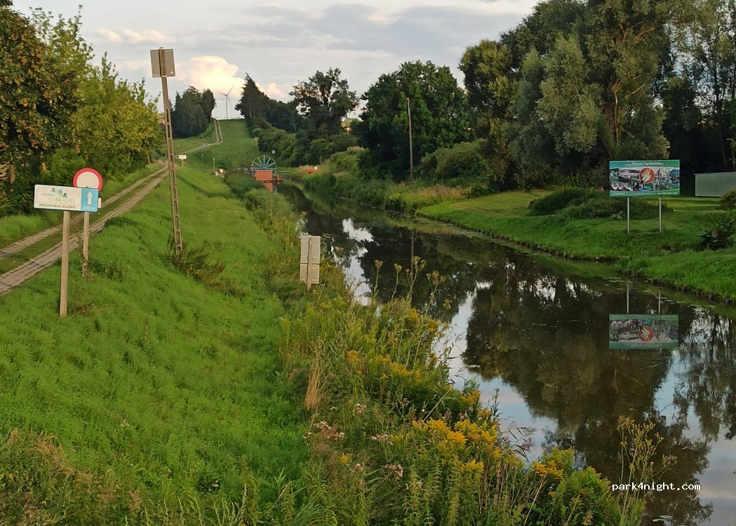 Gratis parkeren naast het Elblag-kanaal op slechts 300 meter afstand, waar u de autolift aan de oppervlakte kunt zien. Toilet- en picknicktafels