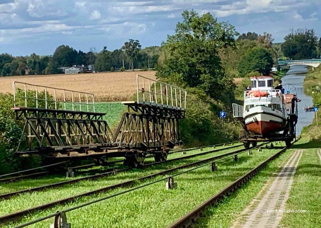 Dieser Platz ist ideal, um das Transportieren der Schiffe zu beobachten. Es gibt hier sogar zwei Plätze, einen ca. 1,5km nach rechts, einen ca. 500m nach links. Leider gibt es keinen Fahrplan, der anzeigt, wann die Schiffe dort ankommen! Infolgedessen haben wir sehr lange gewartet. Aber jetzt wissen wir: Fahrplan nachlesen, wann die Schiffe in Elblag starten, dann sind sie ca. 2 Stunden später an dieser Stelle. Allerdings kommen außer den Fahrgastschiffen auch kleine private Boote. Man kann dort auch übernachten, jedoch ist es durch die angrenzende Straße recht laut.