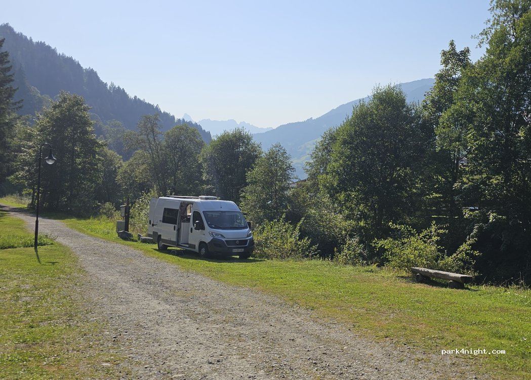 Quiet campervan site at the end of the village. There's a campervan parking spot just across the bridge. Parking is paid during the day. Free after 5 p.m. until 5 a.m. The terrain is not level. Hiking trails start here. Supermarket and restaurants are 1 km away.