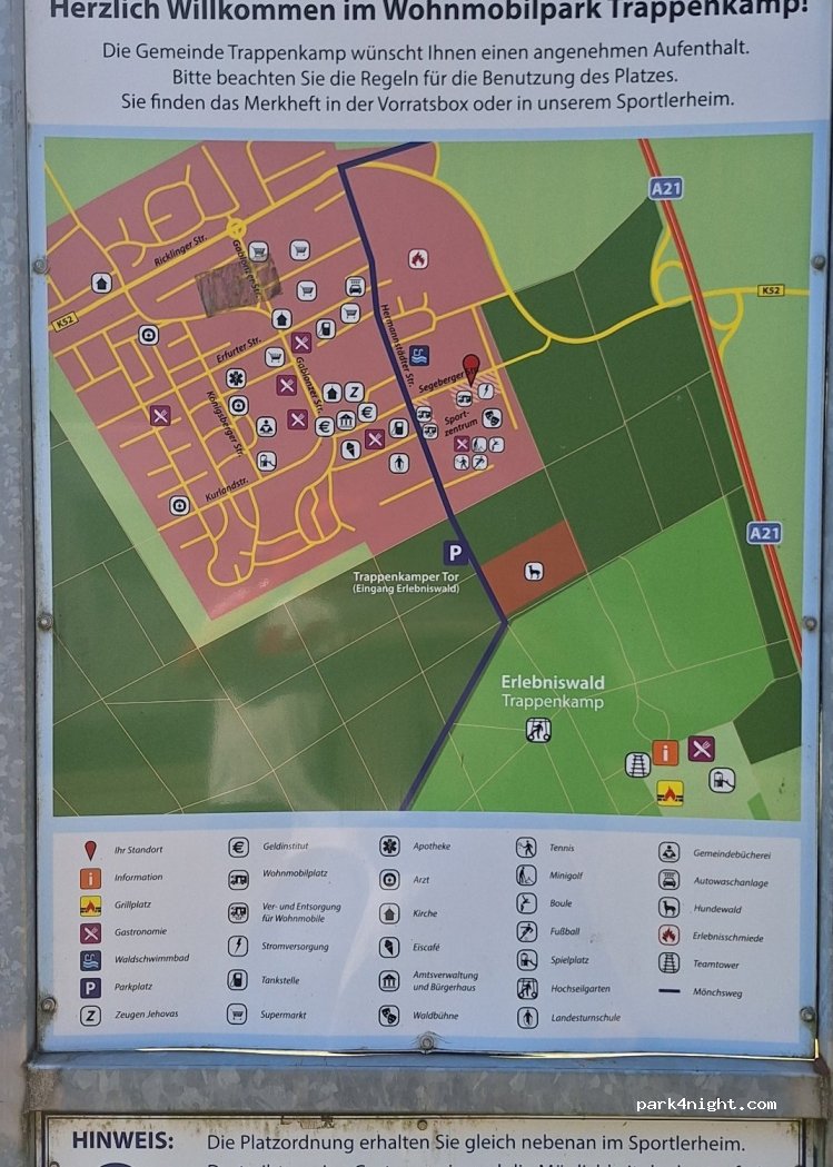 Vielen Dank an die Gemeinde Trappenkamp für diesen Platz. Die Stadtgeschichte ist kurz und Interessant. Sind eine Nacht geblieben und haben uns so dazwischengewurschtelt. Die Straße dahinter wird immer ruhiger. Die Entsorgung ist in der Einfahrt zur Tankstelle, Grauwasser mit Schlauch zu Entsorgen.