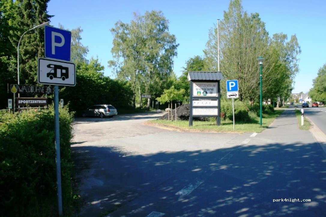 Parkplätze für ca. 8 Fahrzeuge, kostenlos. In einem Waldgebiet mit Sportplatz gelegen, direkt an einer ruhigen Straße.